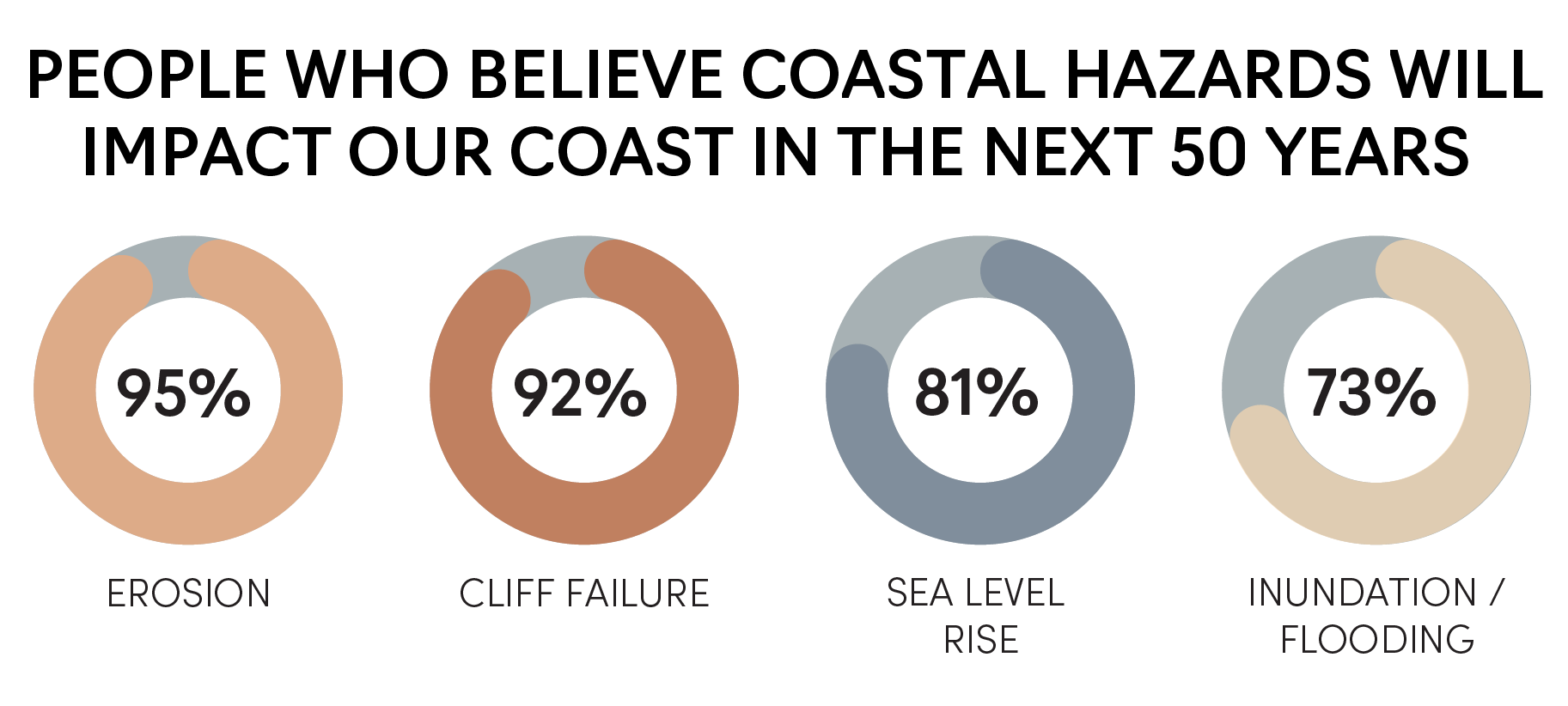 As per the scope of this project, the main coastal hazards we sought input on were erosion, inundation/flooding, cliff failure and sea level rise, which as shown in the graphic below the majority of survey respondents believe will have an impact our coast over the next 50 years.