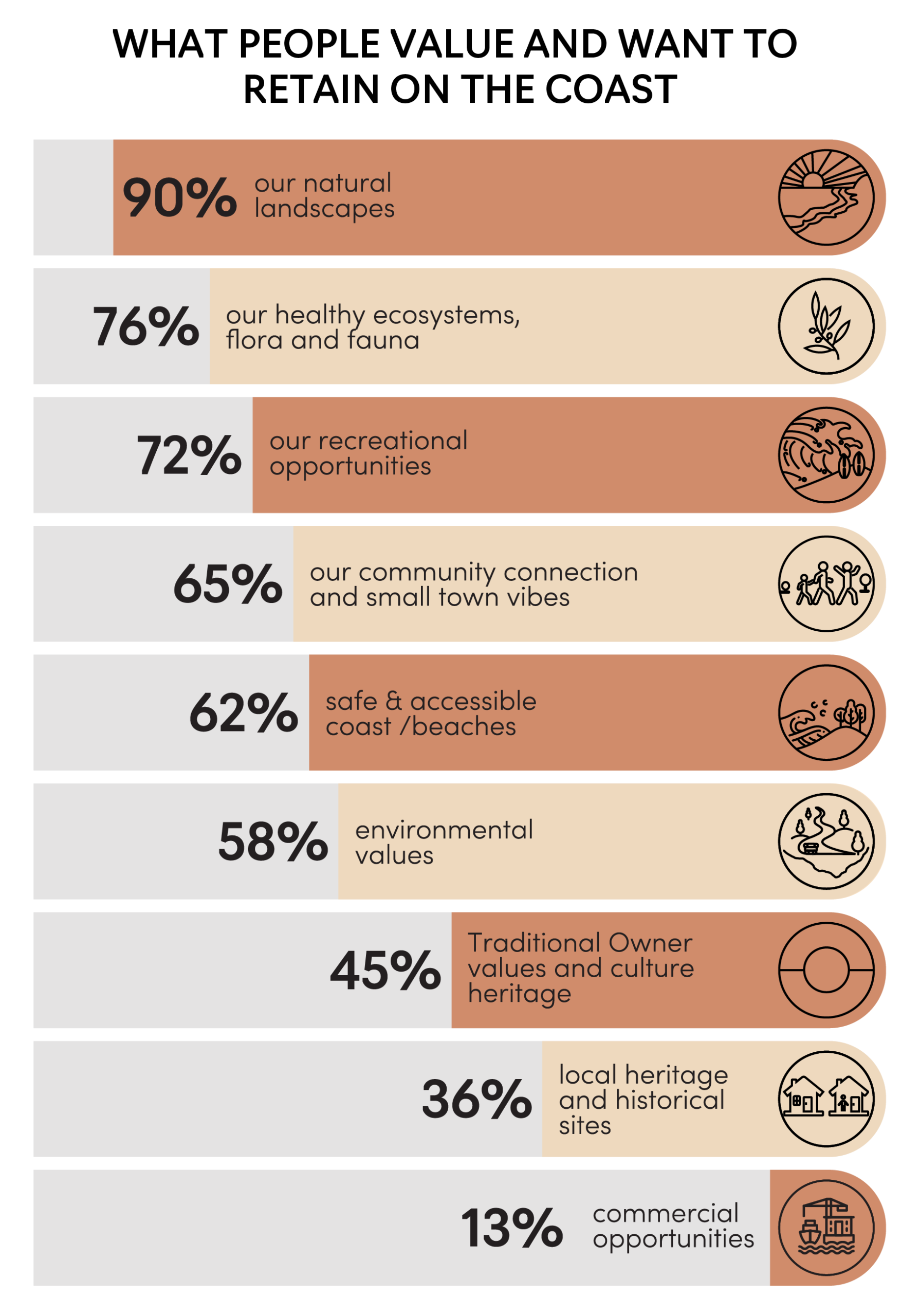 Throughout our online and in-person engagement we heard the coast is highly valued for its stunning vistas, from rugged cliffs to expansive sandy beaches, coastal heathland and rainforest, and marine sanctuaries. That it is home to diverse flora and fauna, all offering a visual feast that changes with the seasons for resident, holiday maker or visitor alike.