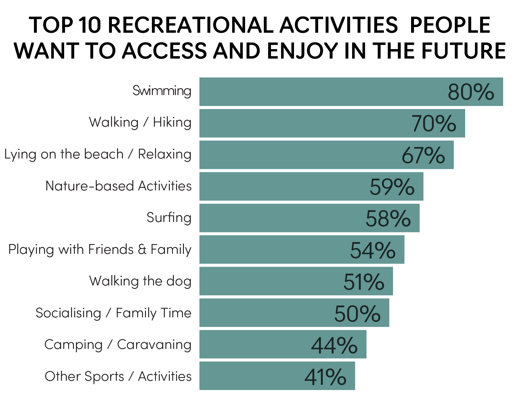 As shown in the graph, over half of all respondents told us they want to be swimming (80%), walking/hiking (70), relaxing on the beach (67%), doing nature-based activities (59%), surfing (58%), playing with friends/family (54%) or walking the dog (51%) on the coast in twenty years’ time.